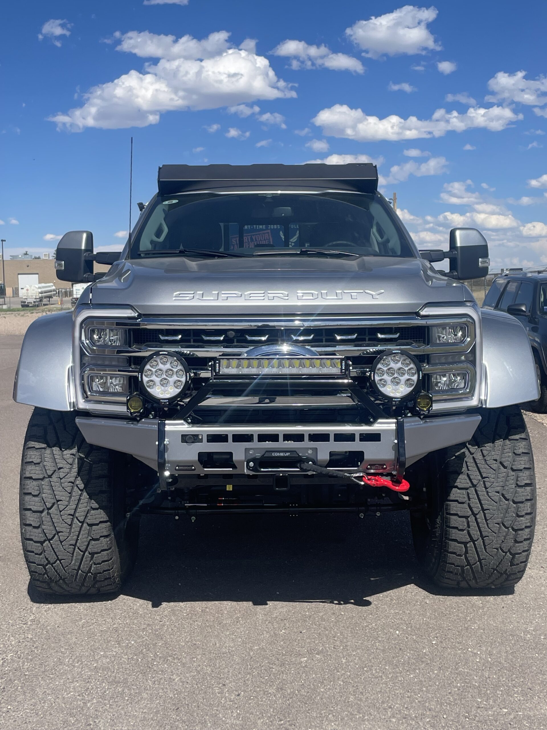 Partnering with Dissent Off-Road, we’re offering the only full-featured aluminum/steel hybrid front bumper for the latest generation of Ford Super Duty trucks. Using steel for towing and lifting points, the bumper weighs in at approximately 142 pounds, adding only 75 pounds when replacing the OE chrome bumper. Our bumper offers two towing points, a hitch receiver, and jacking points. This bumper comes with a steel light bar that will accept a VisionX 20″ LED Shocker bar and includes other mounting points for VisionX ADV spot lights and VisionX fog lights. A ComeUp 12.5K winch fits perfectly within the bumper, and it includes a mounting bracket for ComeUp’s control module which puts the controls and connector at easy reach. A truly expedition-worth piece of hardware. Available in raw aluminum/steel or color matched to your build. Entirely Made in the USA.
