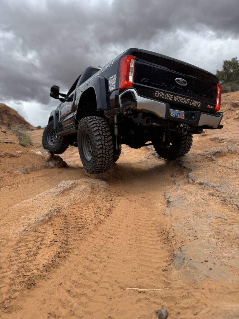 We can configure this truck prior to sale as either an AT44 truck with Nokian/Arctic Trucks 44” tires, or as an AT42 truck with Mickey Thompson 42x15.5” tires on Method 20” wheels. Riding on our proprietary 4-link rear air suspension and equipped with Radflo/Arctic Trucks 2.5” external reservoir shocks, its comfortable and capable over many types of terrain. Arctic Trucks branded leather seat trim moves the XL trim upscale, and a full suite of tire inflation controls and airbag controls have been installed in the center console. Other features include a Dissent Off Road/Arctic Trucks hybrid aluminum/steel front bumper with a ComeUp 12.5K winch installed and our suite of VisionX lights including a 20” dual-color light bar, 8.7” ADV spot lights and amber fog lights. In the bed, an aluminum tool box houses air compressors for the suspension and the tires. A custom fabricated side exit exhaust provides some bark!